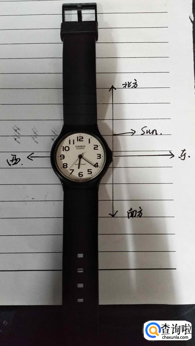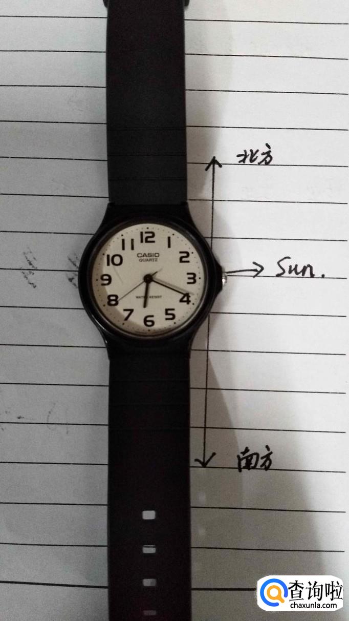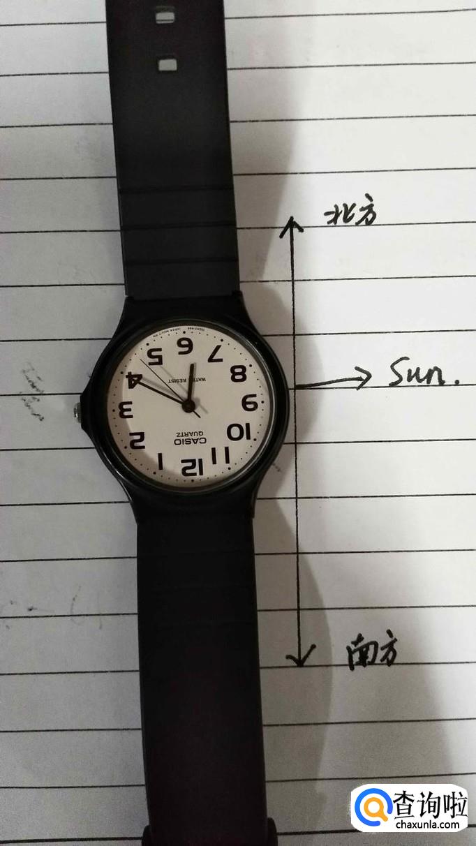 如果是在下午,那么时针所指的时间则为18点,将其除以二则得到九。将九指向太阳,则12所指的方向就是北方。
