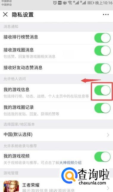 弹出的界面,我们将我的游戏信息的开关向左滑动;