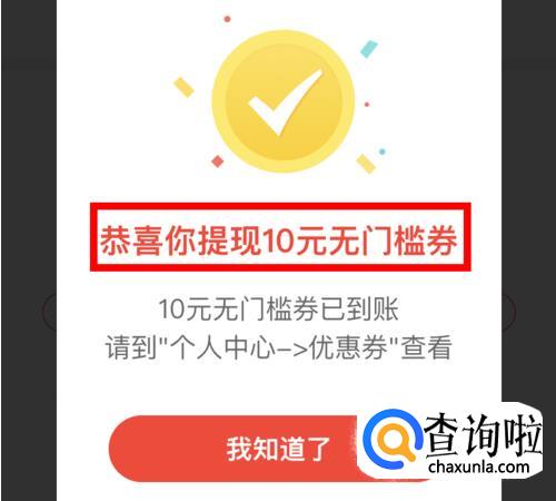 接着就会弹出我们兑换成功的提示框,我们到“个人中心”中,就可以看见刚刚兑换的优惠劵了,但是有时间限制,结束之前使用就可以了。