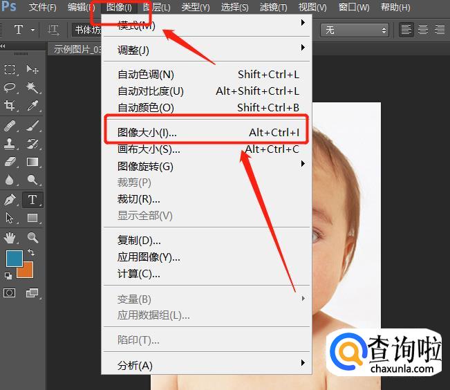 然后我们点击ps顶部显示栏的“图像”,在下拉的窗口中选择“图像大小”。