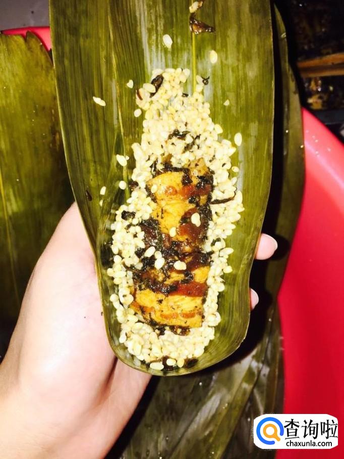 最后把粽叶折成斗状,把糯米和五花肉放入粽叶里面用粽绳包裹好就可以了。