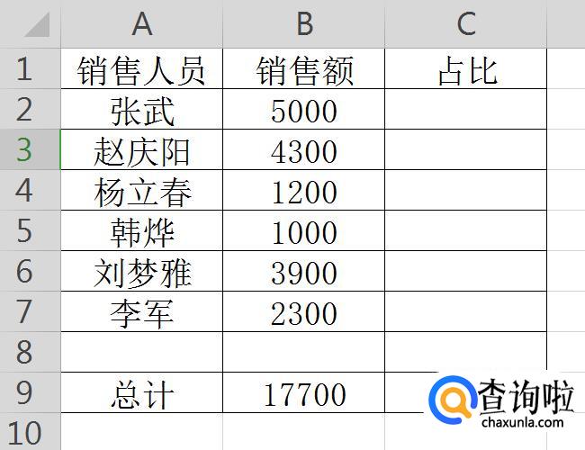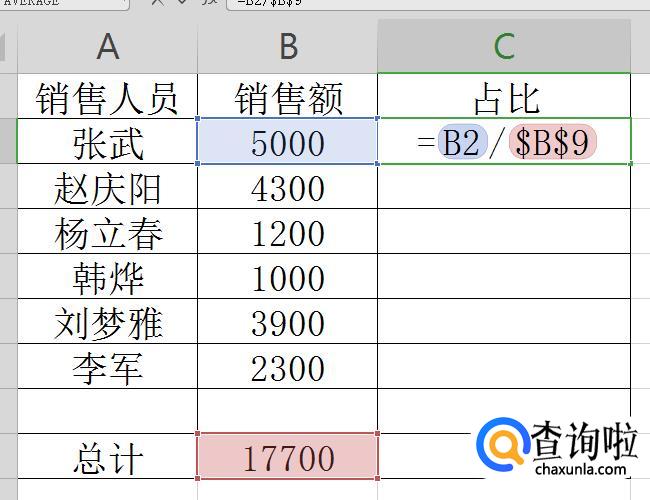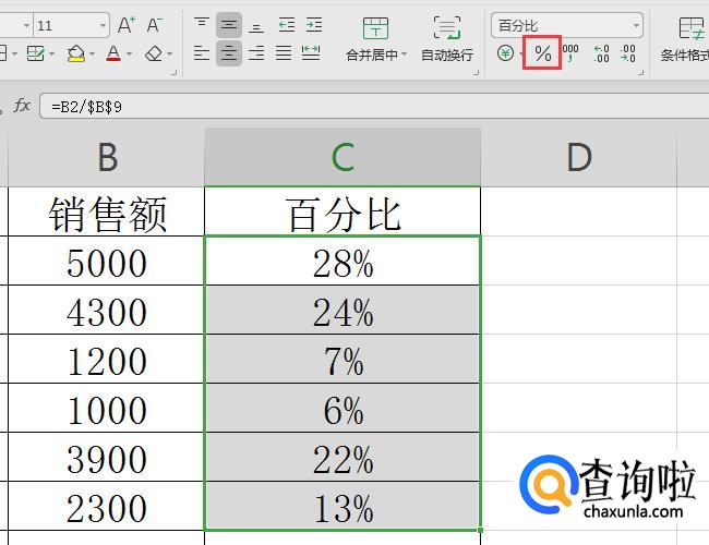 在需要显示结果的表格中输入计算公式,例如在C2中输入“=B2/B9”其中“”是固定不变的意思。
