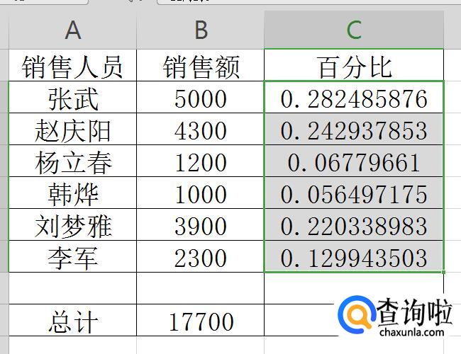 点击回车即可计算出答案,将鼠标移到C2右下角等待光标变成黑色十字符号,按住拖动到底即可快速计算下方的百分比。