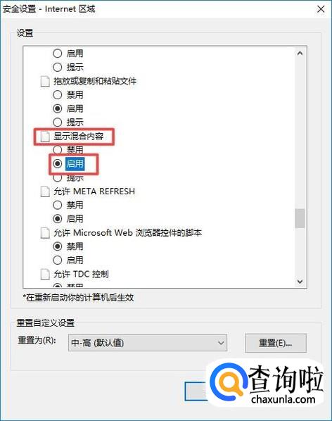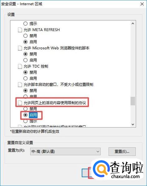 然后我们将允许网页上的活动内容使用限制的协议给启用,然后我们点击确定;