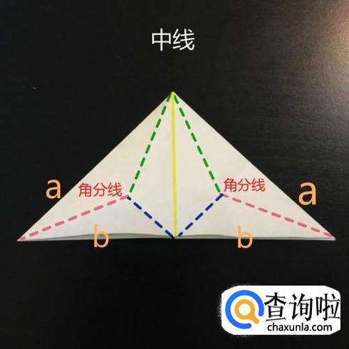 将三角形左右两边各沿着角分线(图中红蓝绿虚线)折出折痕。