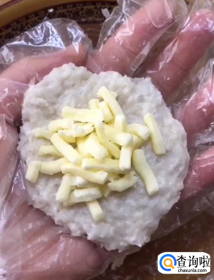 然后我们将面团搓成长条,切成块,用擀面杖擀成皮,包上芝士