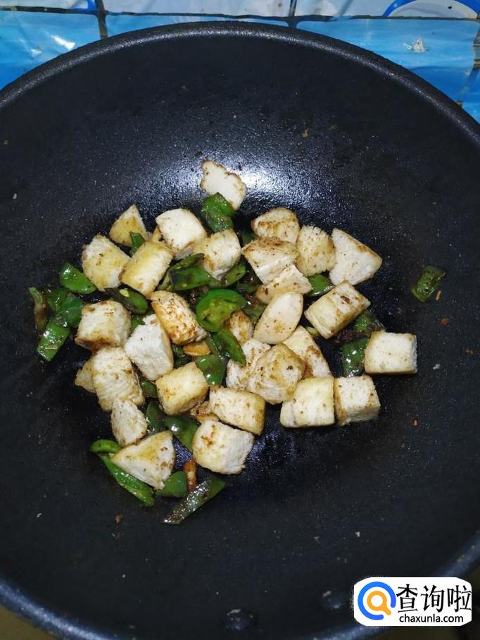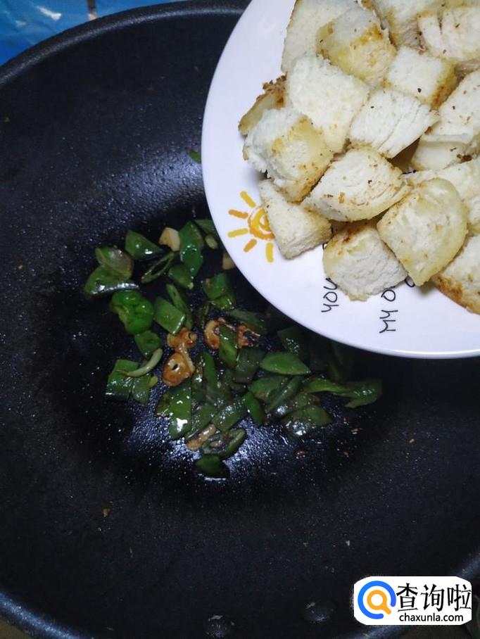 将煎过的馒头,倒入锅中,和蔬菜一起翻炒均匀。