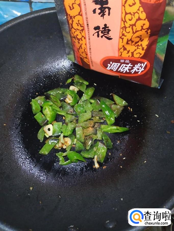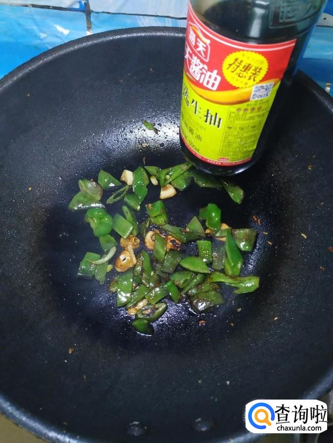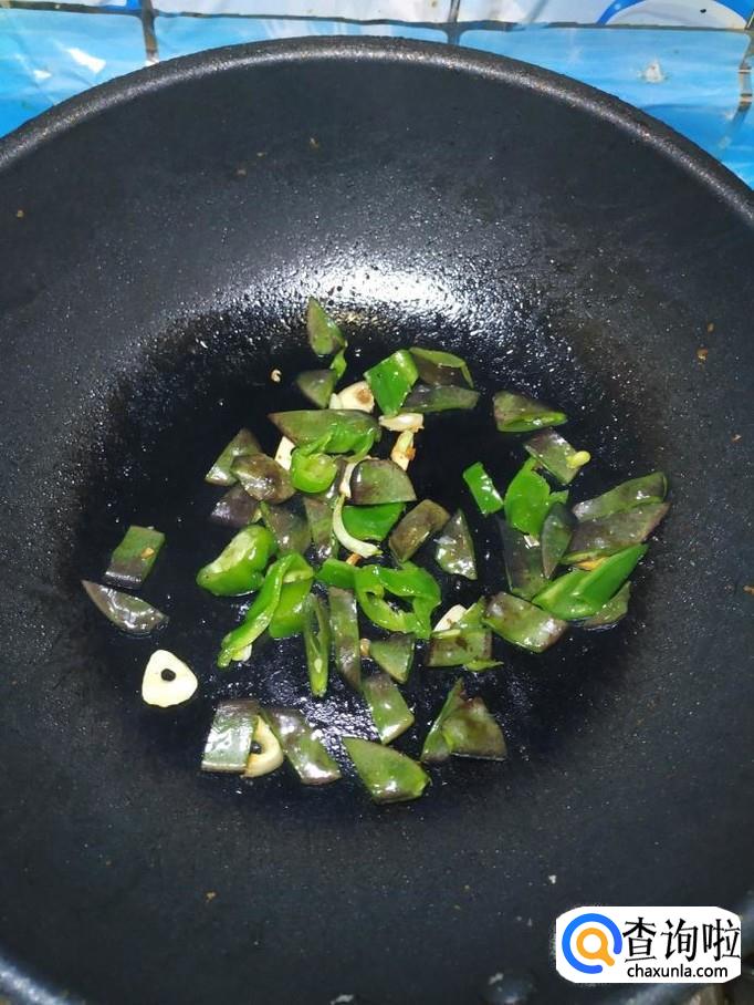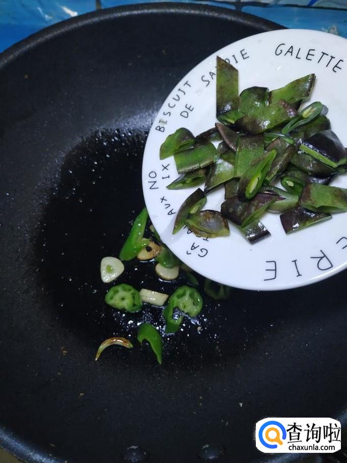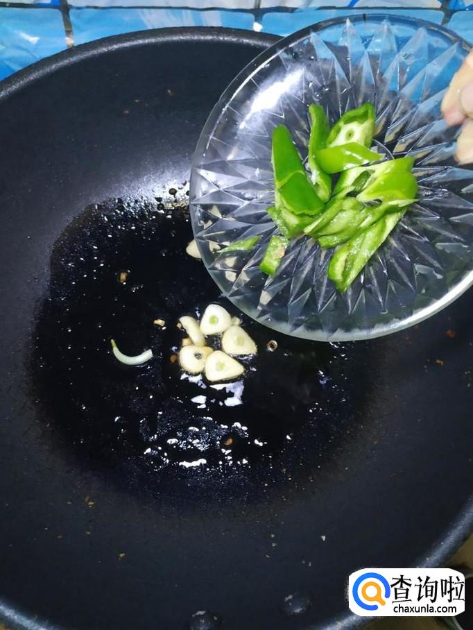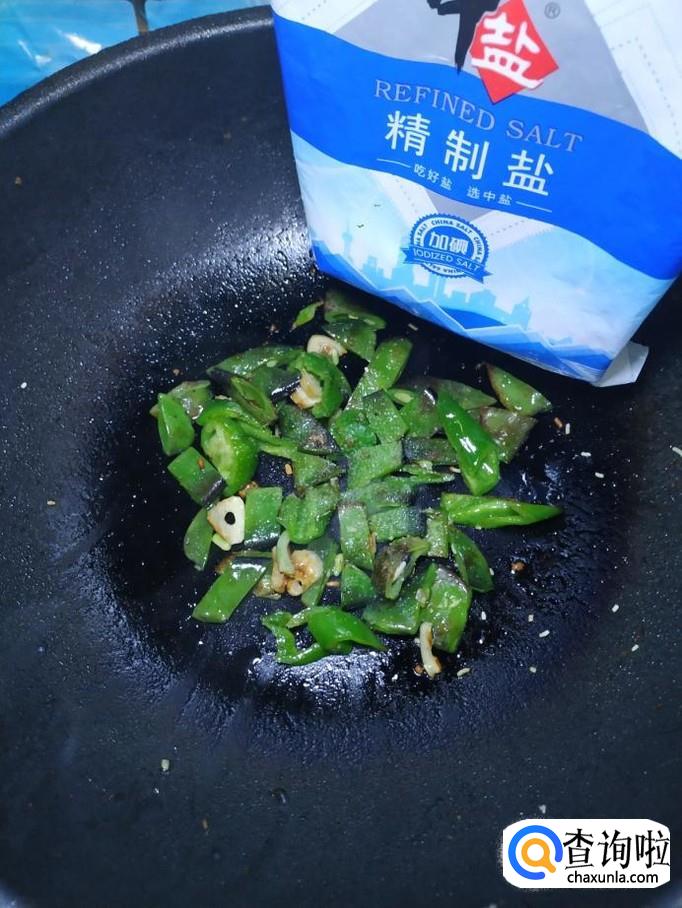 炒锅中再放入适量油,油热后,放入蒜片爆香,然后将青椒丝倒入锅中翻炒均匀,再将准备好的豆角片倒入锅中,和青椒一起翻炒均匀。
