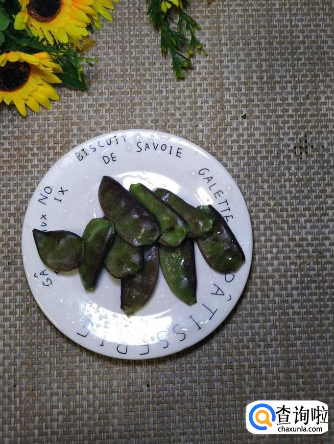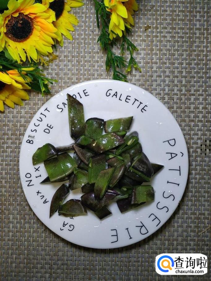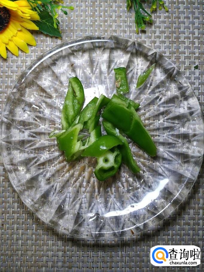 准备适量豆角,用清水洗净后,去除豆筋,用刀切开,切成小片;再准备适量青椒,洗净后切成丝,放入盘中备用。