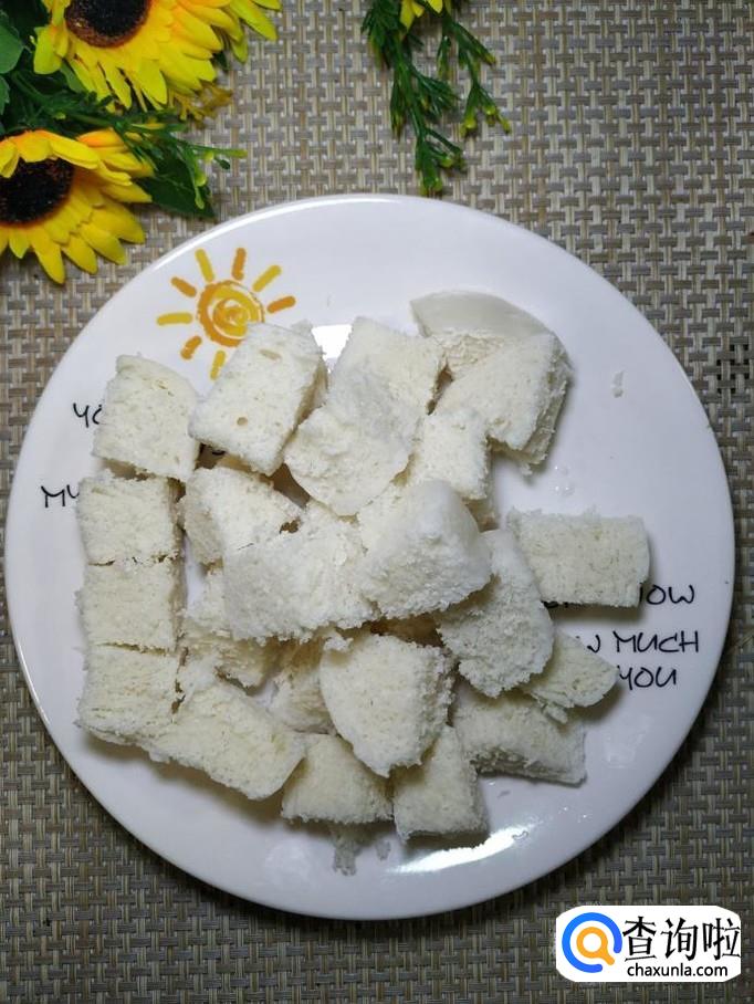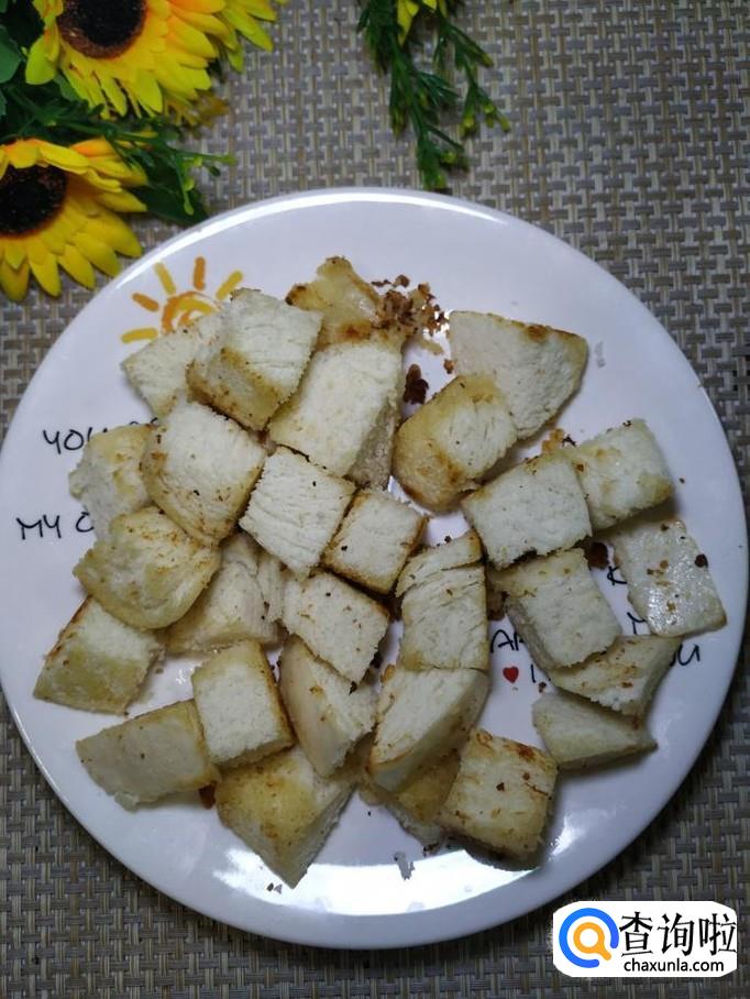 准备一个剩馒头,切成方块,放入盘中备用。
