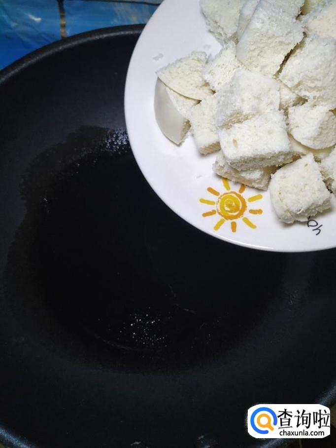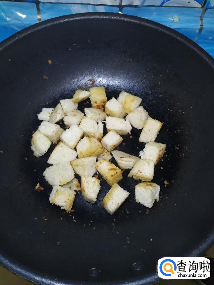 炒锅中放入适量油,油热后,将馒头放入锅中,翻炒均匀,可以用勺子快速搅拌,炒至馒头表面微微发黄,盛出备用。