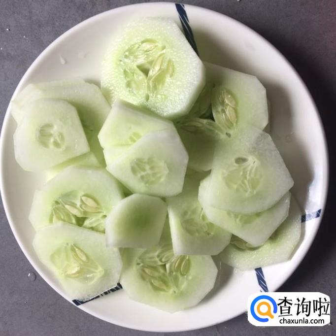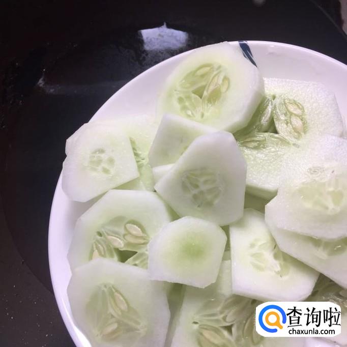 然后把黄瓜去皮,切成薄片,如下图所示。