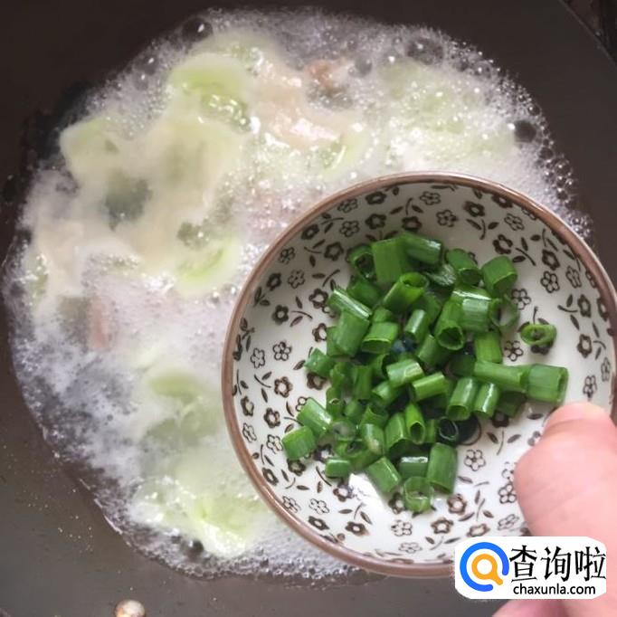 等到锅中水开倒入黄瓜煮五分钟,如下图所示。