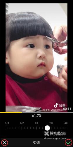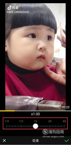 进入视频快慢放编辑页面后,页面中有一条横线,横线上有1/4、1/2、1X、2X、4X五个播放速度,其中大于1X为快放,小于1X为慢放。通过移动白色标点,来设置视频的播放速度。