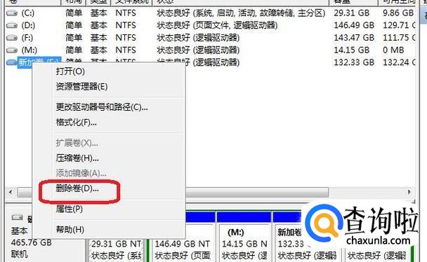 我们右键点击需要删除的磁盘分区,选择“删除卷”。