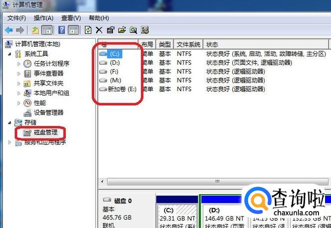 然后进入计算机管理界面,我们点击左侧栏的“磁盘管理”,就能看到当前计算机的所有磁盘分区。