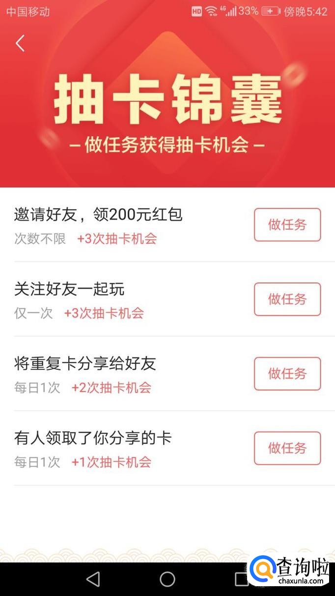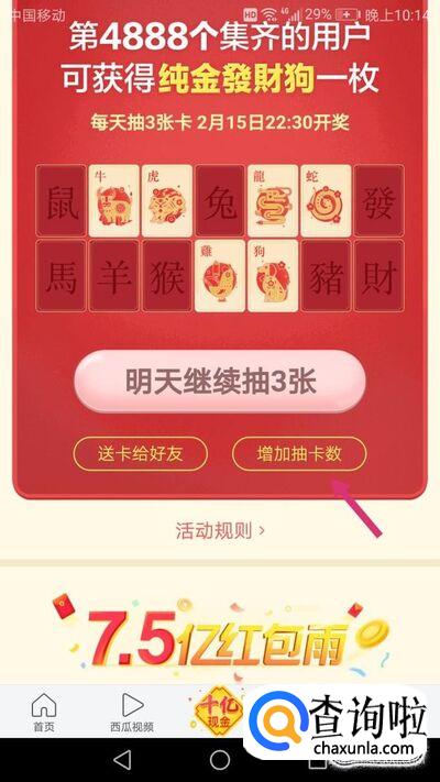 点开增加抽卡数,里面有四个任务可以增加抽卡机会,如下图,集齐12生肖,领红包!