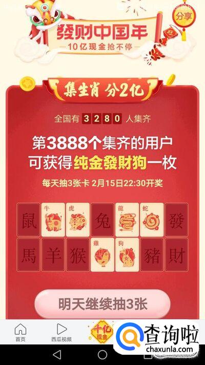 打开“十亿红包”后,就会出现集生肖领红包,每天都可以免费抽取三次机会,集齐12生肖。