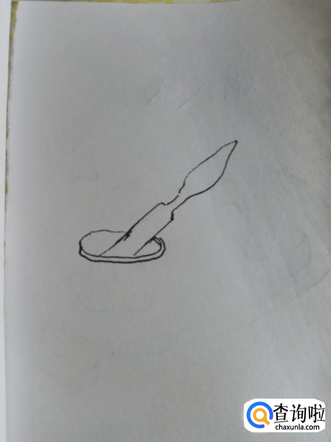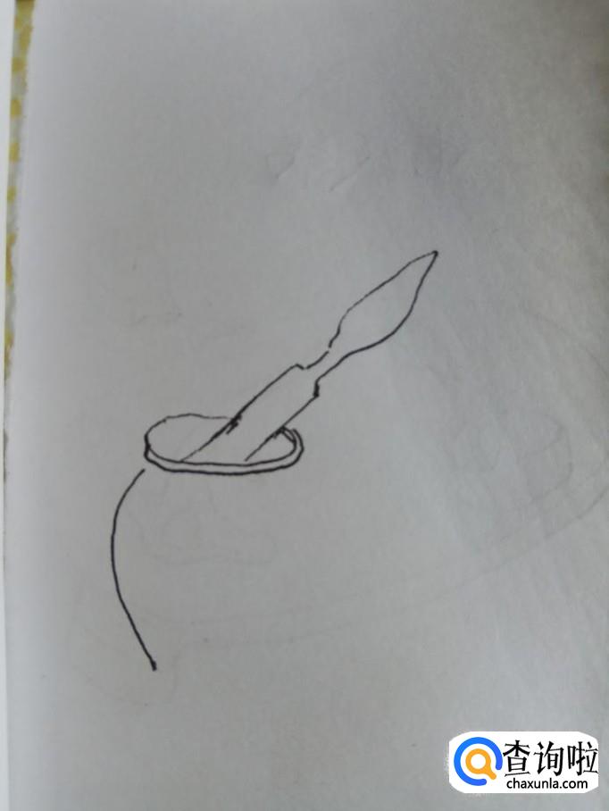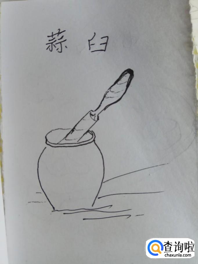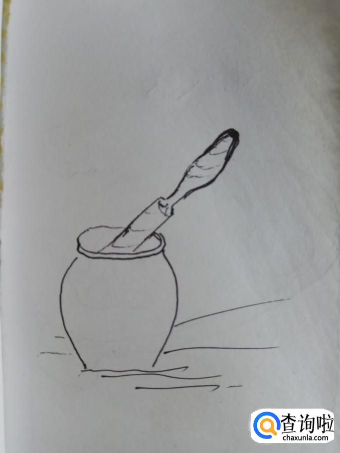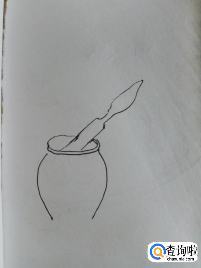将两条平行线向上延伸,画出两条曲线,尾端相交在一起,这是捣蒜锤。再用一条弧线在蒜臼的口部画一下,这样更有立体感。