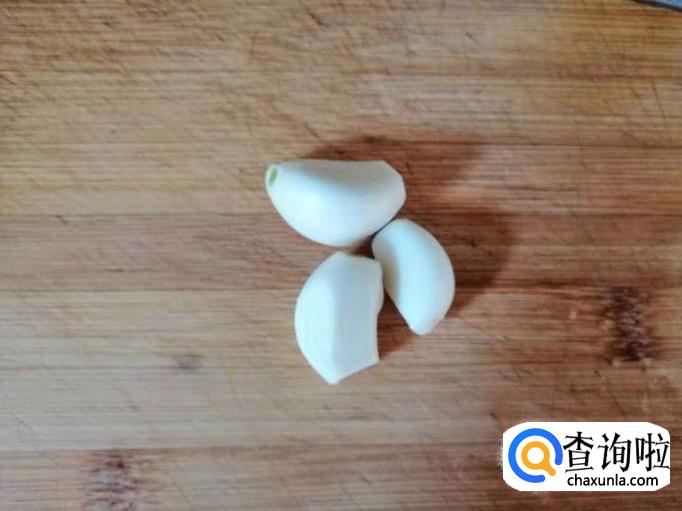 然后我们可以拿几瓣蒜,先把蒜放在案板上,用刀背拍平,然后把蒜切成下图所示的蒜沫