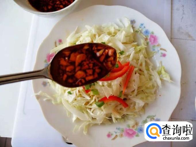 然后我们把刚刚调好的调味料撒在最上面,这样子我们的白菜红彩椒就做好了,接下来就可以享受美味了。