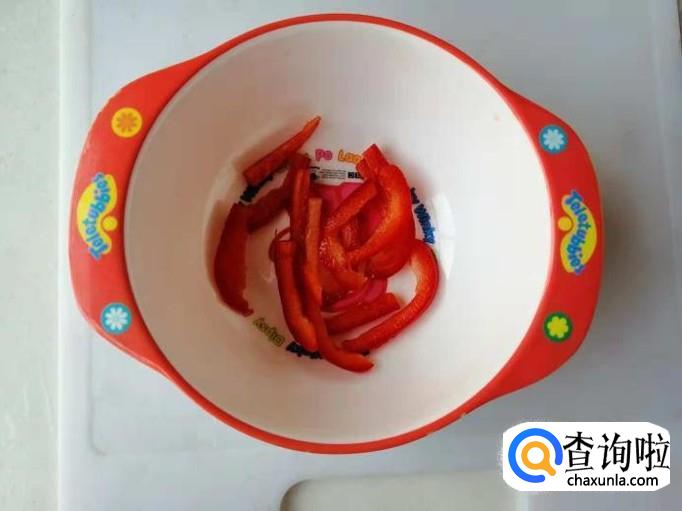 把彩椒清洗干净以后我们把它放在案板上,然后去掉里面的籽,还有外面的把,然后把它切成如下图所示,大小相同的条状,放在小碗中做备用。