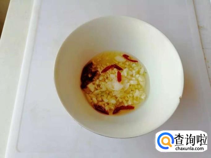然后我们把刚刚切好的蒜和辣椒都放在小碗里加上一勺盐或味精,注意这里我们在加的时候盐不要放得太多,否则对我们身体也是没有好处的。
