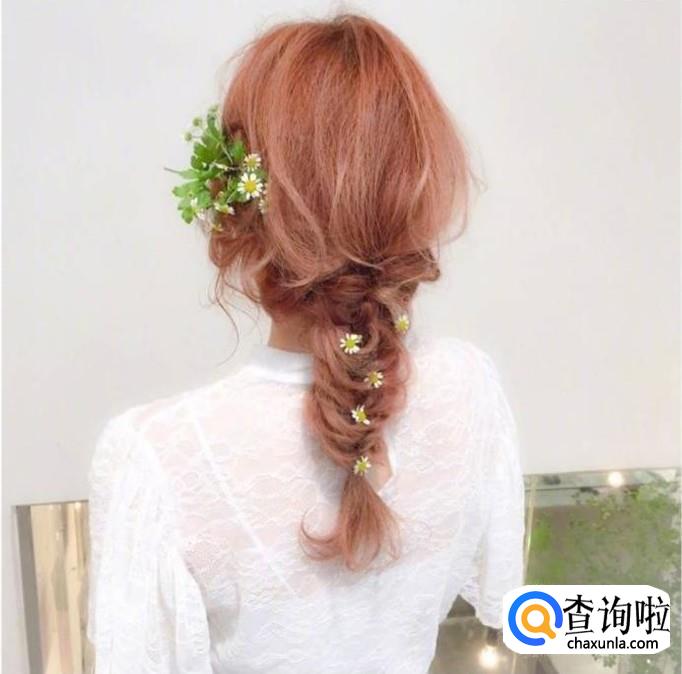 这款花环发型很简单,首先将头发编一个麻花辫,用头绳绑好后,再轻轻地拉一拉辫子,使头发更加蓬松一些,最后带上花环或者夹上配饰。