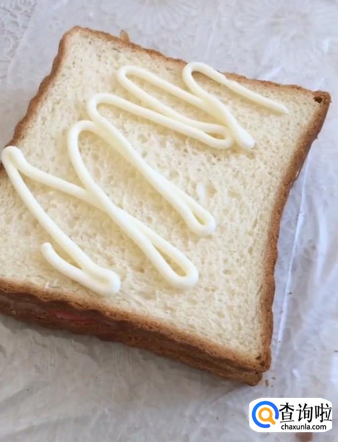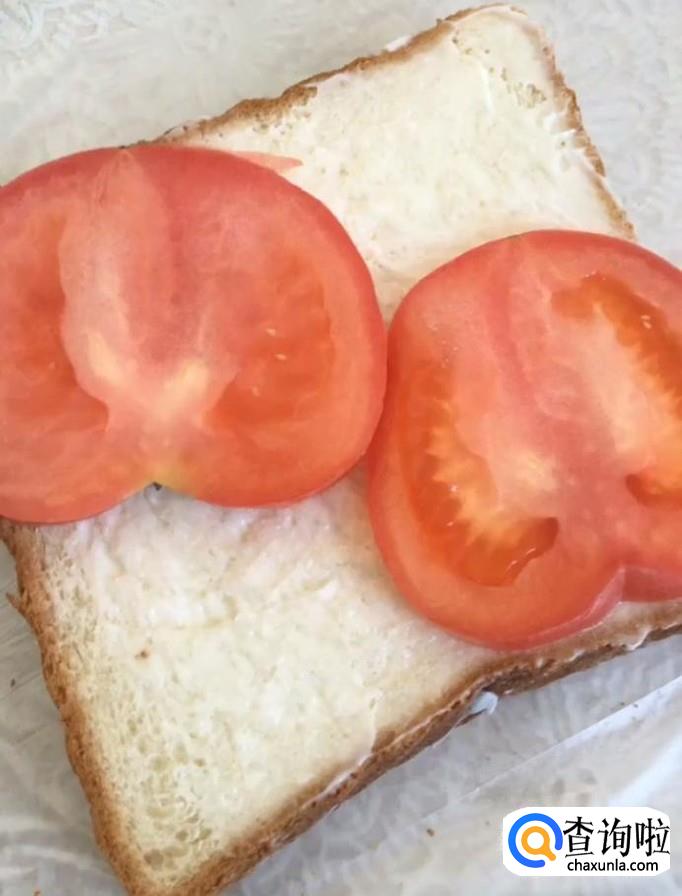 然后我们准备一些面包片,在上面挤上一些沙拉酱,放上切好的西红柿