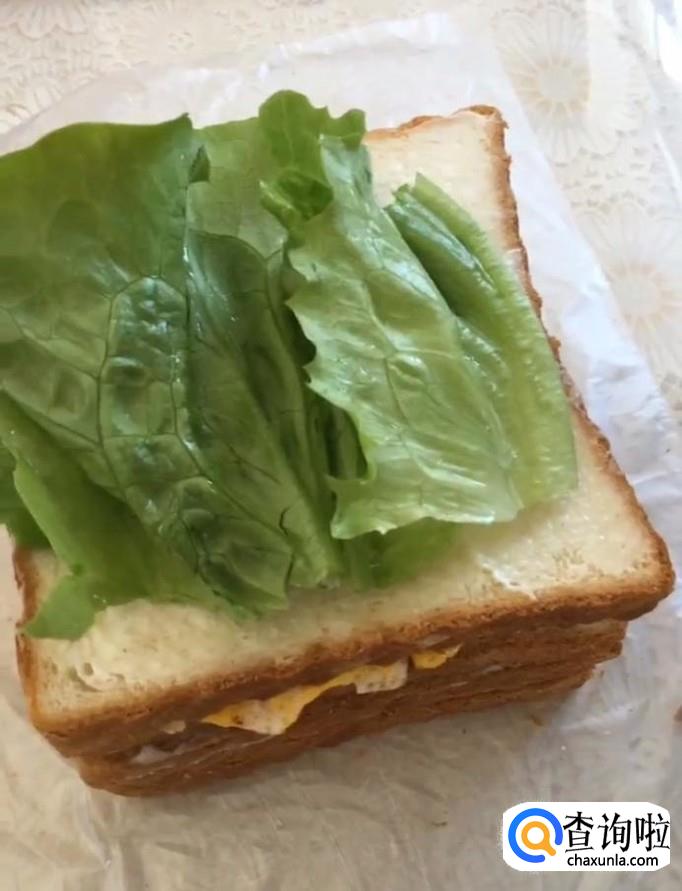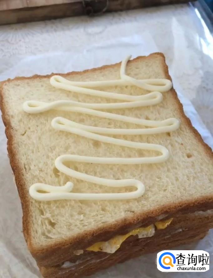 接着我们再放一片面包,挤上沙拉酱,放上煎熟的培根,依次放上鸡蛋,生菜