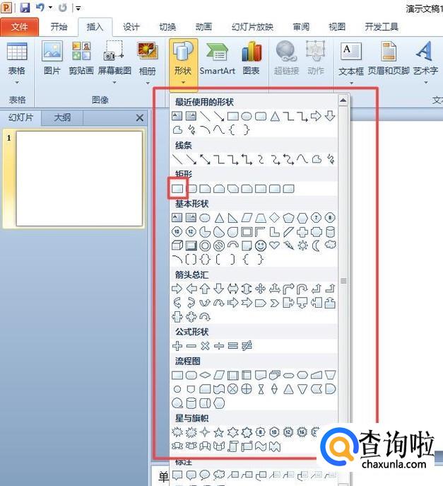 弹出的界面,我们可以看到很多形状,这个其实就是绘图工具处了,我们根据我们的需求选择一个我们想要绘出的图形,此处我们点击矩形;