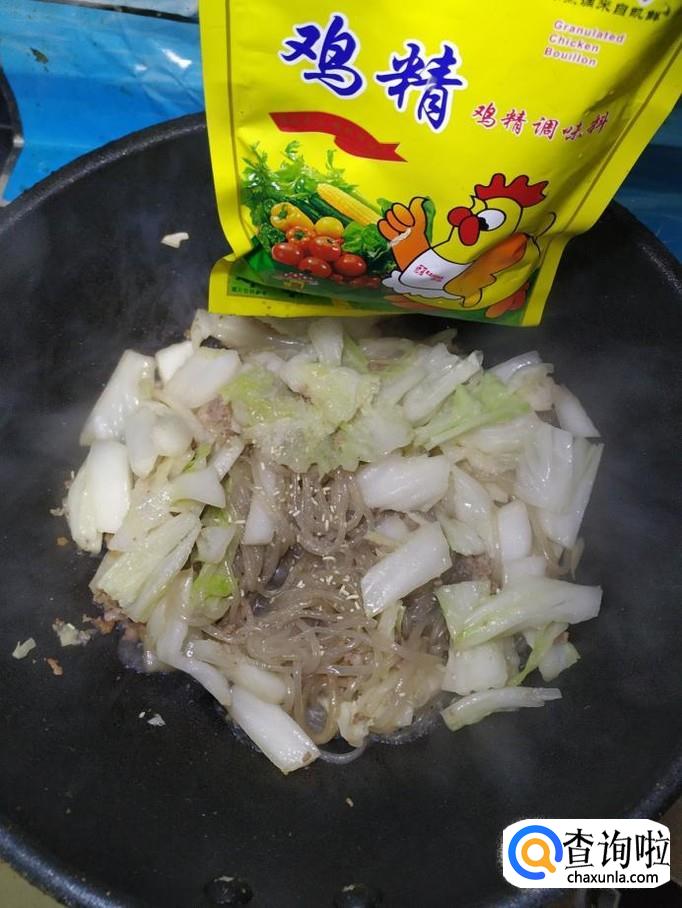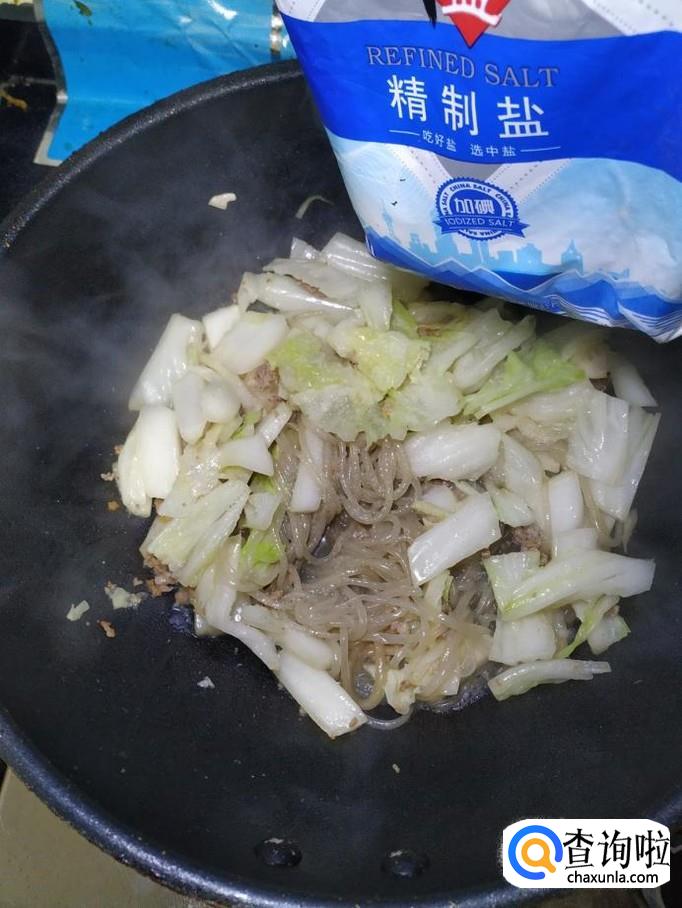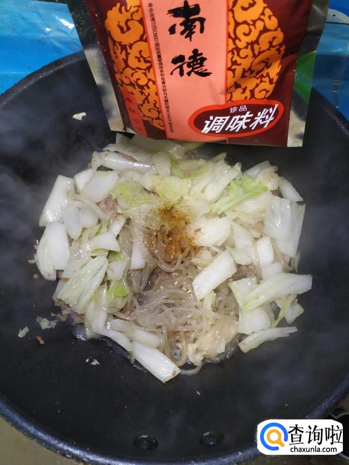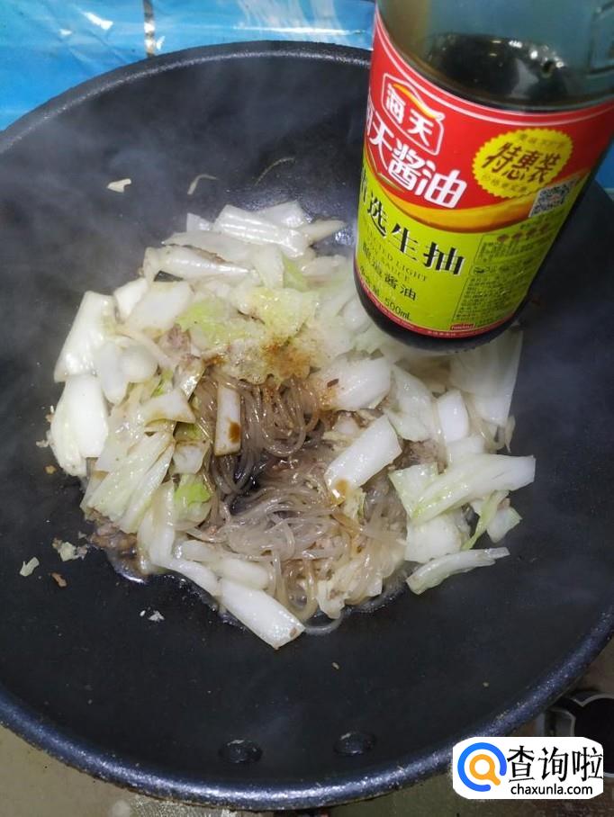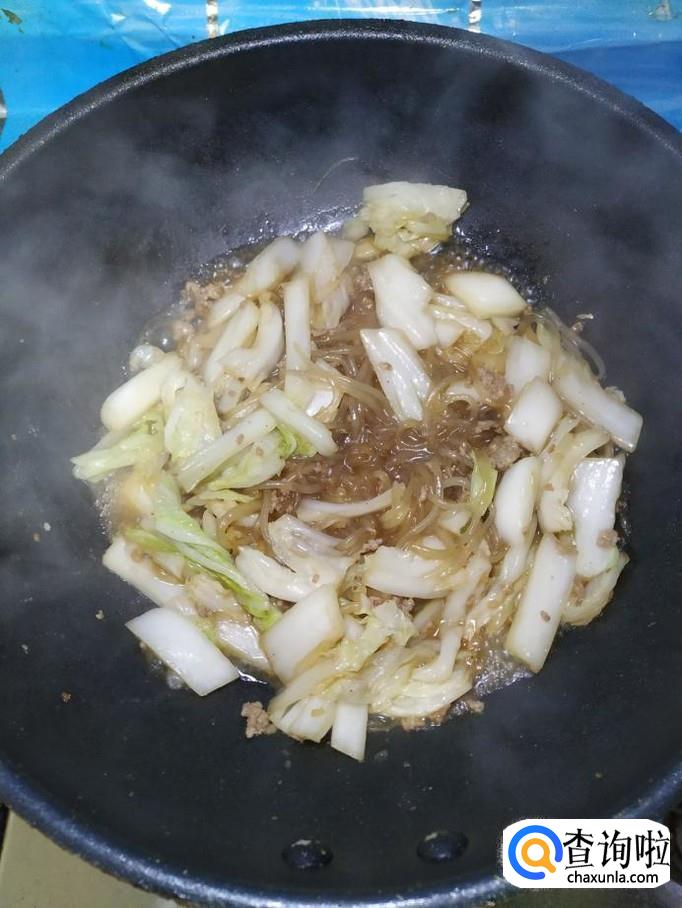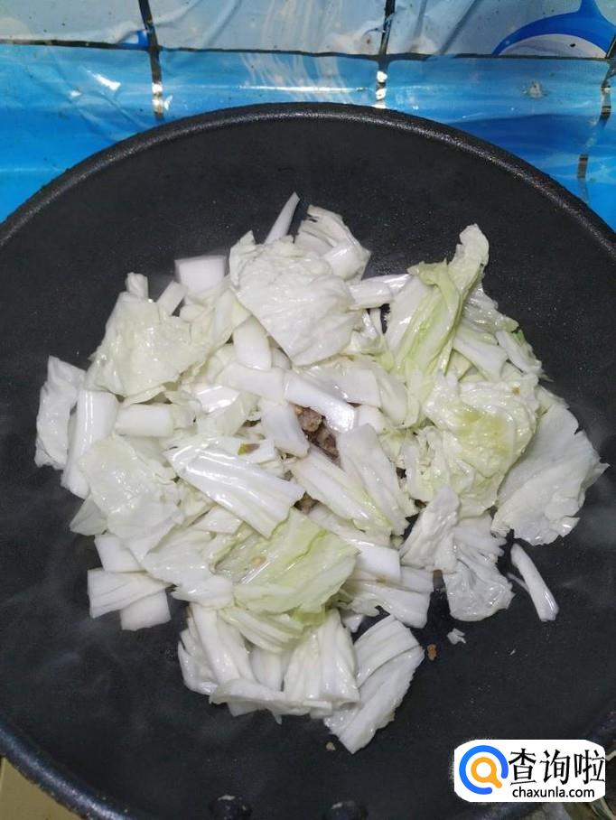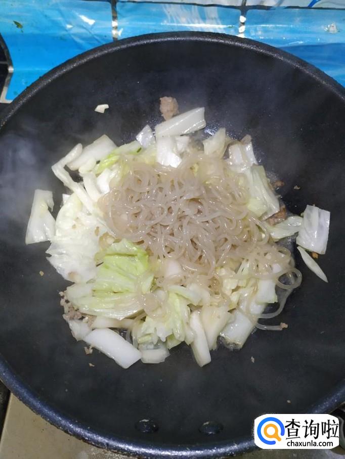 将大白菜倒入锅中,翻炒均匀,炒至白菜变软之后,将粉条倒入锅中,翻炒均匀。