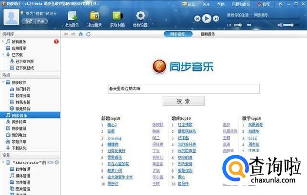 第五步,对于音乐的下载,只需要点击“同步音乐”,然后在搜索框中输入自己要找的音乐名称并按“搜索”,这时,就会出现你要找的音乐了,点击“试听”或是“下载”,下载完后,可以在“资料库”中“所有音乐”里看到下载好的音乐,选中你要添加到设备的音乐,并按“添加到设备”。