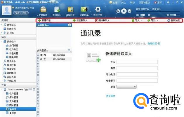 第六步,对于通讯录的备份与恢复,只要选择设备中的“通讯录”,这时就可以看到在设备中所有的通讯的信息了,然后可以选择“新建联系人”“删除联系人”“导入”与“导出”,这个“导入”与“导出”就是“备份”和“恢复”。