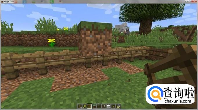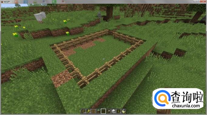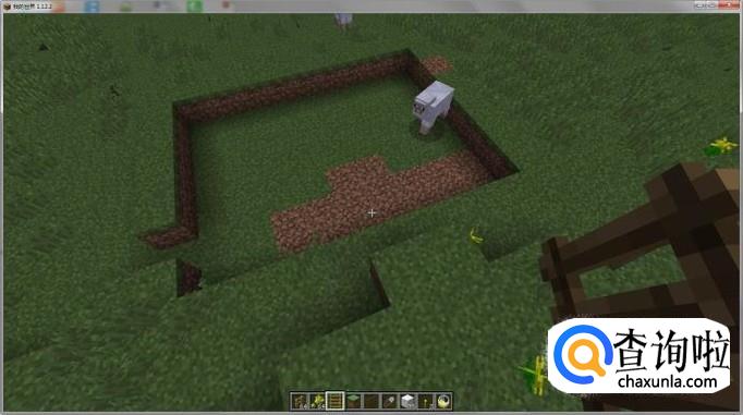 首先用土方块围成一个坑,并在一角空出一方块。(注:土围成的坑要比打算围成羊圈大一圈),如图所示: