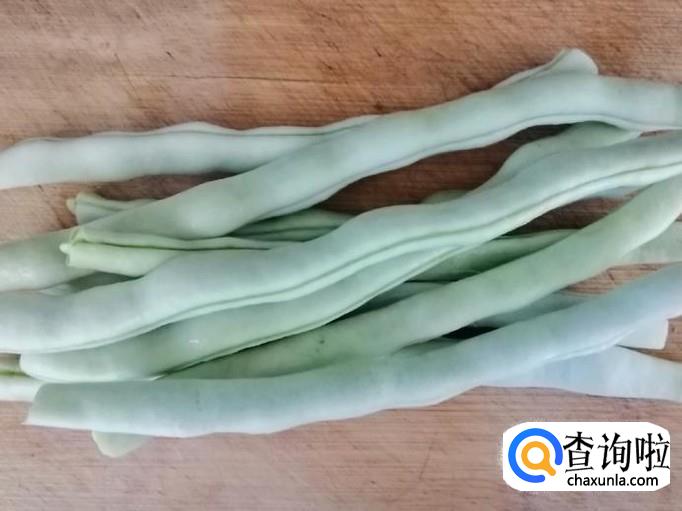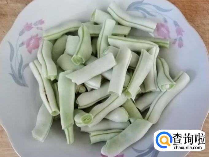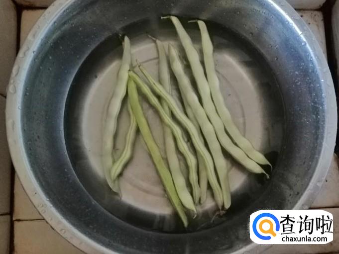 取适量新鲜芸豆,用水冲洗干净,然后再用清水泡一会儿,最后去掉芸豆头尾,把芸豆掰成一寸长短的芸豆段,让人盘中待用。