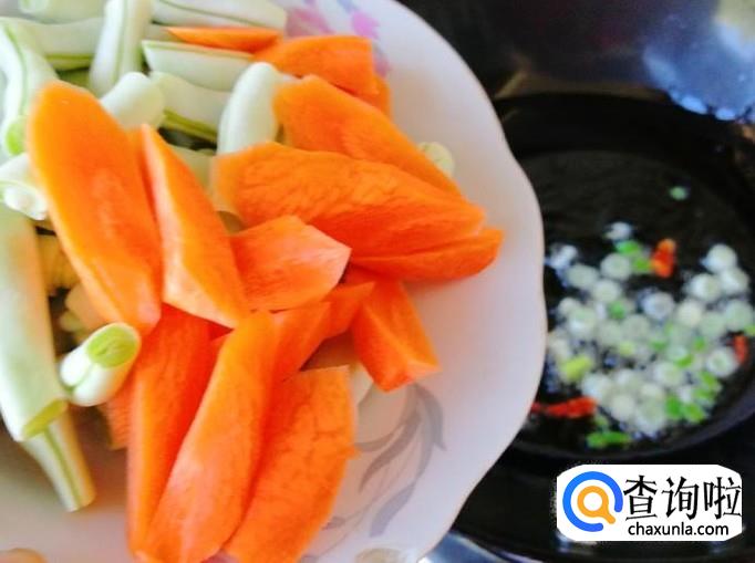 把备好的芸豆胡萝卜盘端过来,炒锅放油,油热后先放葱辣椒炝锅,炒香后放入芸豆胡萝卜,因为这两个菜不大容易熟,所以先放翻炒片刻。