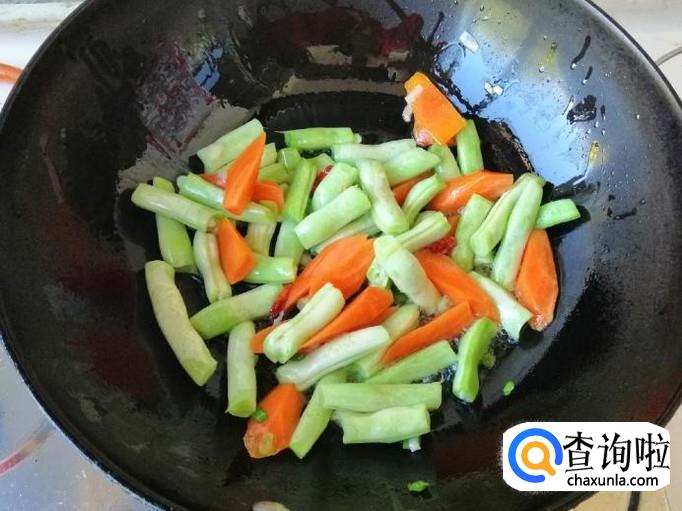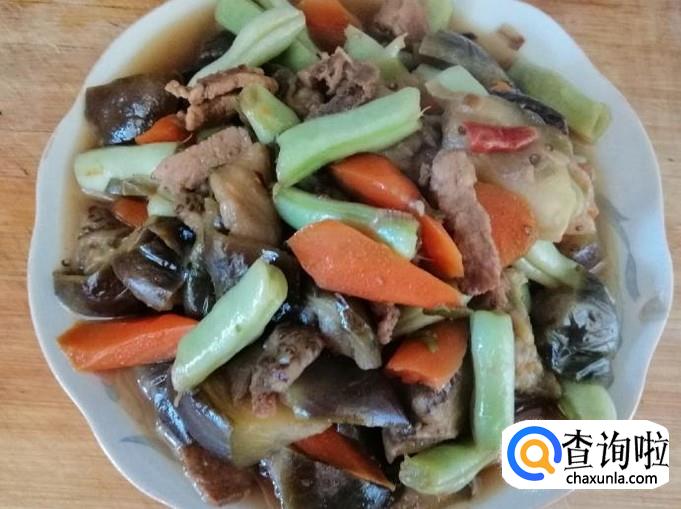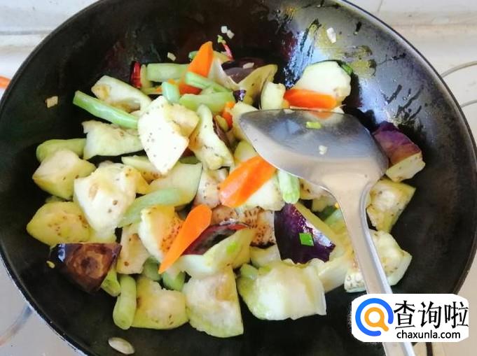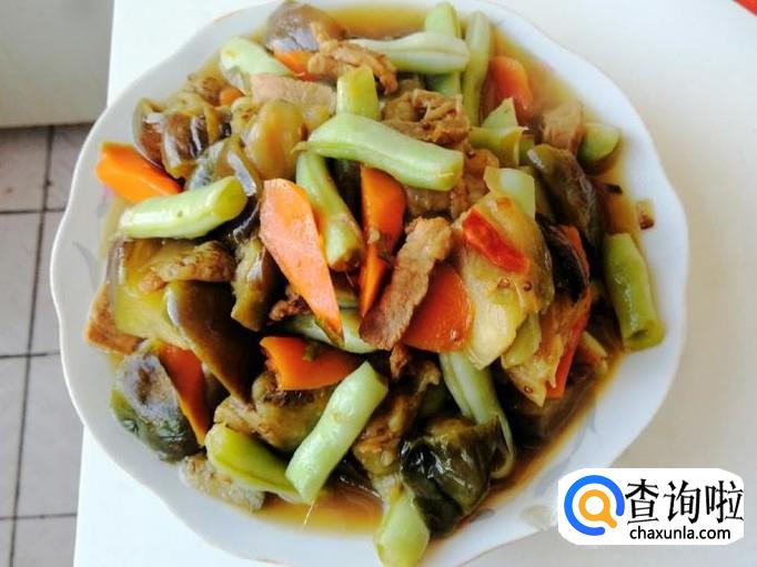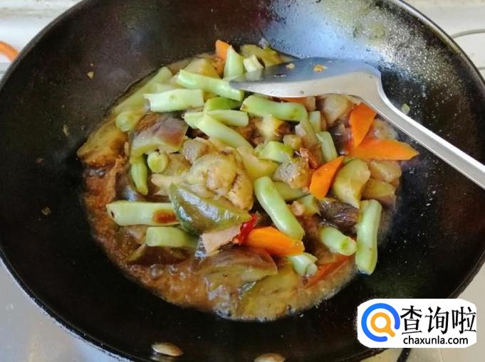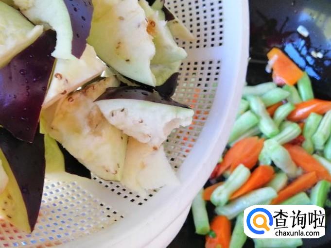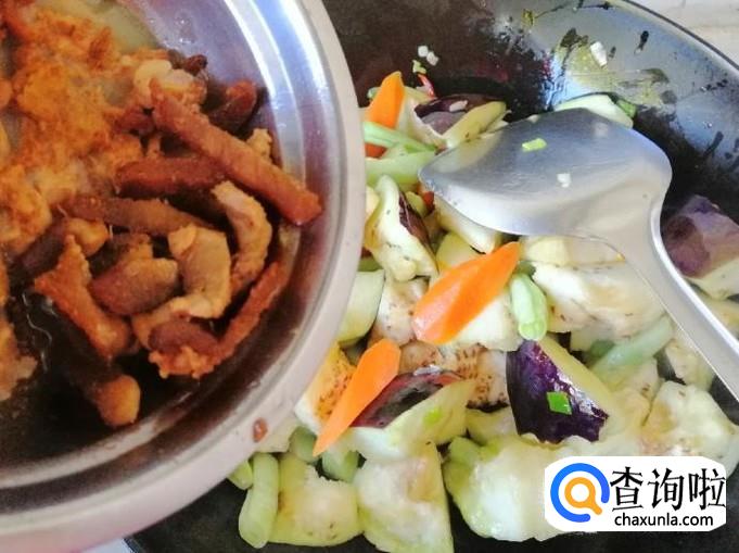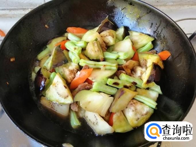 看到芸豆胡萝卜变色时,加入备好的茄子块,翻炒均匀,可以选择在放完茄子块后加入熟猪肉,再翻炒均匀。