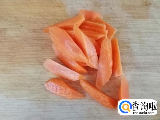 选一根新鲜的胡萝卜用清水洗净去皮去头尾,然后滚切成菱形块待用,因为这个菜需要加水炖,所以胡萝卜可以切厚点。