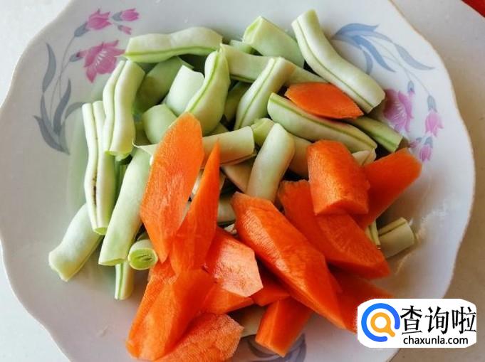 芸豆适量,胡萝卜一个,圆茄子一个,熟猪肉适量,葱、蒜、干辣椒适量,生抽少许,盐适量。