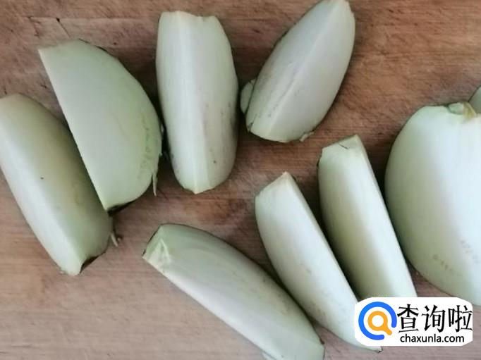 把茄子从中间切开,一分为二,然后如图切成几小块,用手再掰成茄子块,茄子块大点没关系,因为需要加水炖,如图掰好茄子块后,用清水再冲一遍,这样炒出来的茄子不会发黑,最后控水待用。