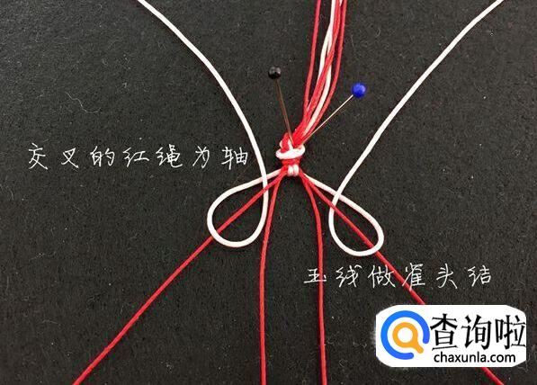 然后我们以交叉的红绳为轴,玉线做雀头结。