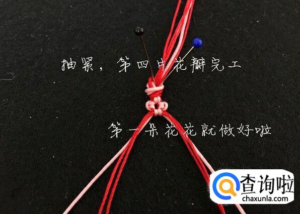 然后我们再将其抽紧,这样第四片花瓣就做好了,也就是说,我们的第一朵花做好了。