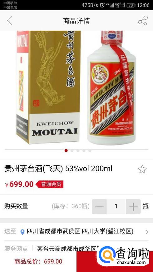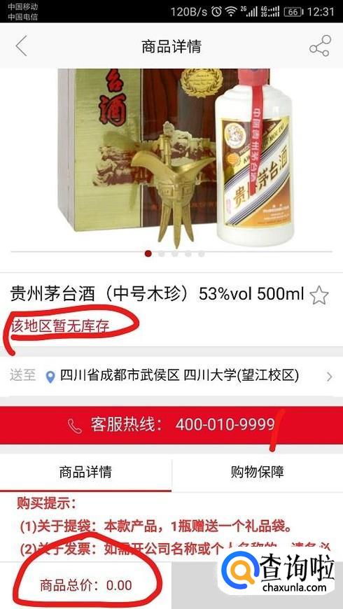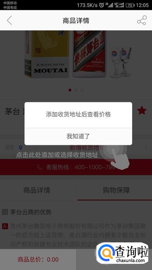 点击第二款酒,跳转界面。如果您还没有设置地址的话,根据提示设置地址。设置好后可以看到价格,如果没有价格说明该地区没有存货,需要重新选择哦。