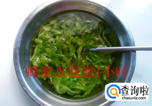 将腌制好的苦瓜用清水洗2遍,将盐味去掉一些;然后再次放入清水后再放入2勺蜂蜜浸泡1小时。