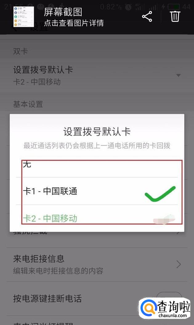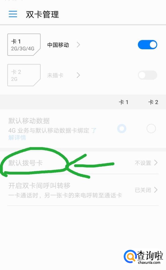 点击“默认拨号卡”,勾选“中国联通”,将你的大王卡设置为默认拨号卡。