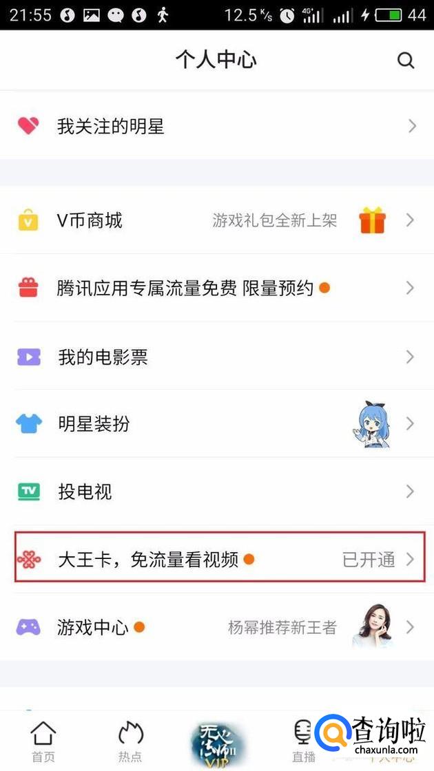 此时没有免流图标的你们应该是这样的吧,显示大王卡,免流量看视频“未开通”。