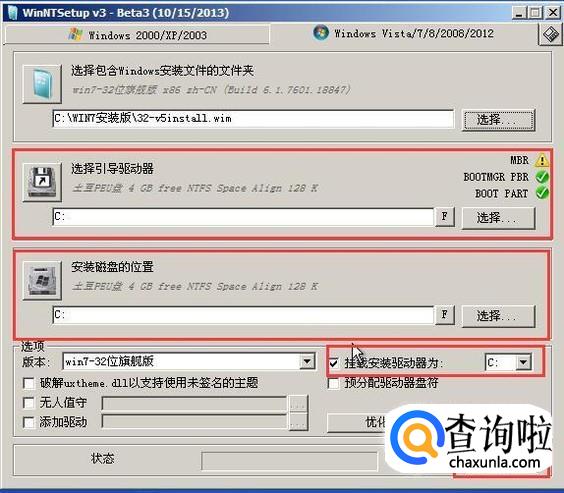 选择引导的驱动和选择如何分区,选择C盘,把它作为系统盘,然后点开始安装,如图所示。