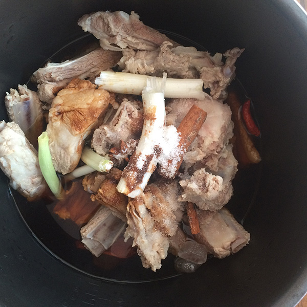 4、加入葱、姜、蒜、调料盒及沸水(与排骨同高),大火煮沸后加盖上阀用高压锅压制。
