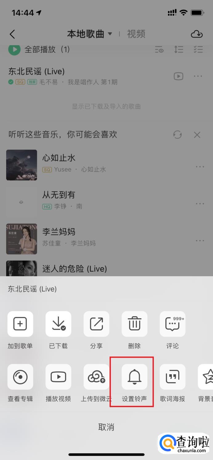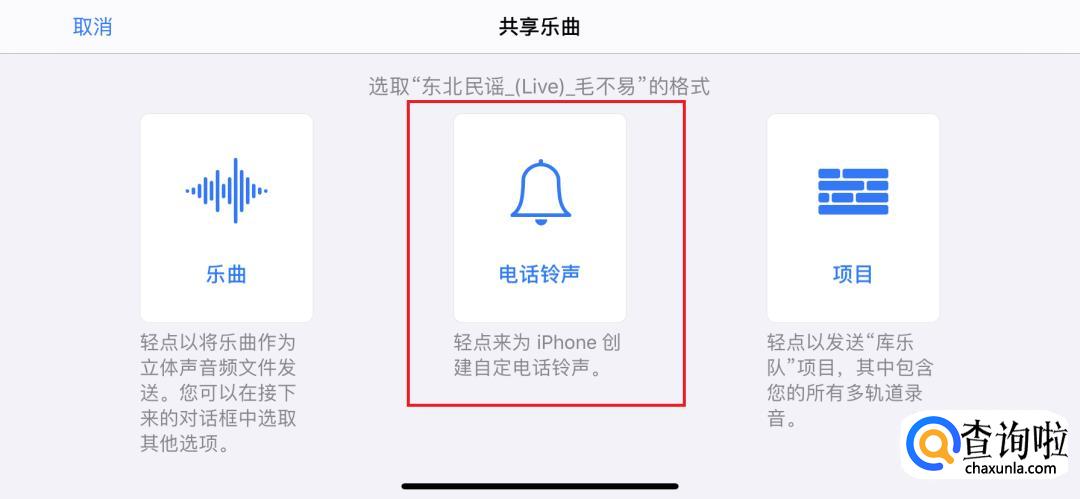 点击后,进入共享乐曲界面,点击的电话铃声的选项。